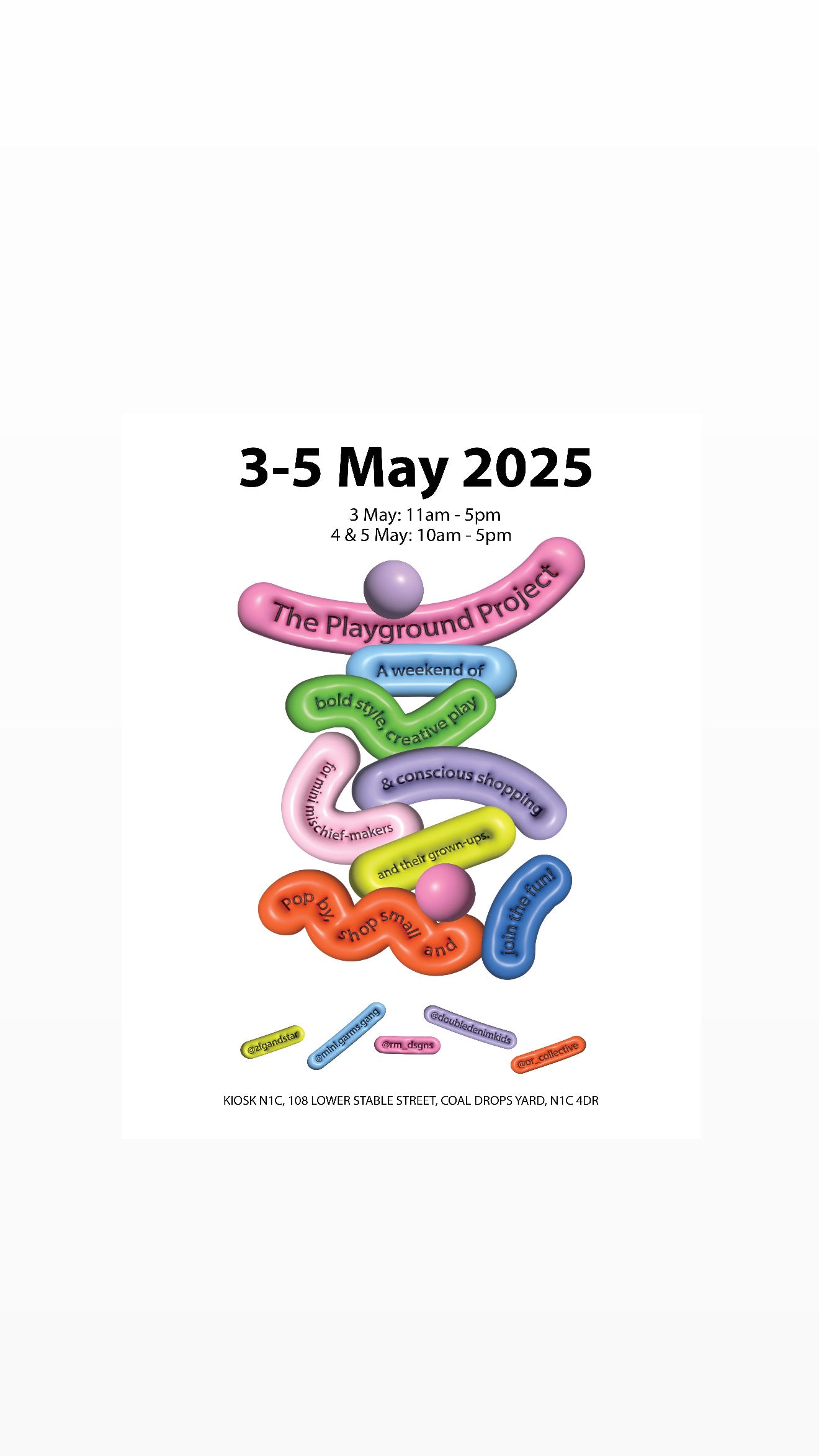 A ONE-OF-A-KIND POP-UP EVENT CHAMPIONING SUSTAINABLE FASHION AND DESIGN FOR CHILDREN. FIVE PIONEERING SUSTAINABLE CHILDRENSWEAR AND DESIGN BRANDS. TAKING PLACE AT KIOSK NIC IN COAL DROPS YARD, KINGS CROSS (108 LOWER STABLE,LONDON, NIC 4DR, ENGLAND) FROM 3RD - 5TH MAY 2025. THIS COLLABORATIVE SPACE WILL BRING TOGETHER A MIX OF HIGH-QUALITY, HANDPICKED VINTAGE, EX RENTAL RESALE, UPCYCLED FASHION, MODERN, CONSCIOUSLY DESIGNED FOOTWEAR, AND HAND-PAINTED, UPCYCLED WEARABLE ART, ALL UNDER ONE ROOF.