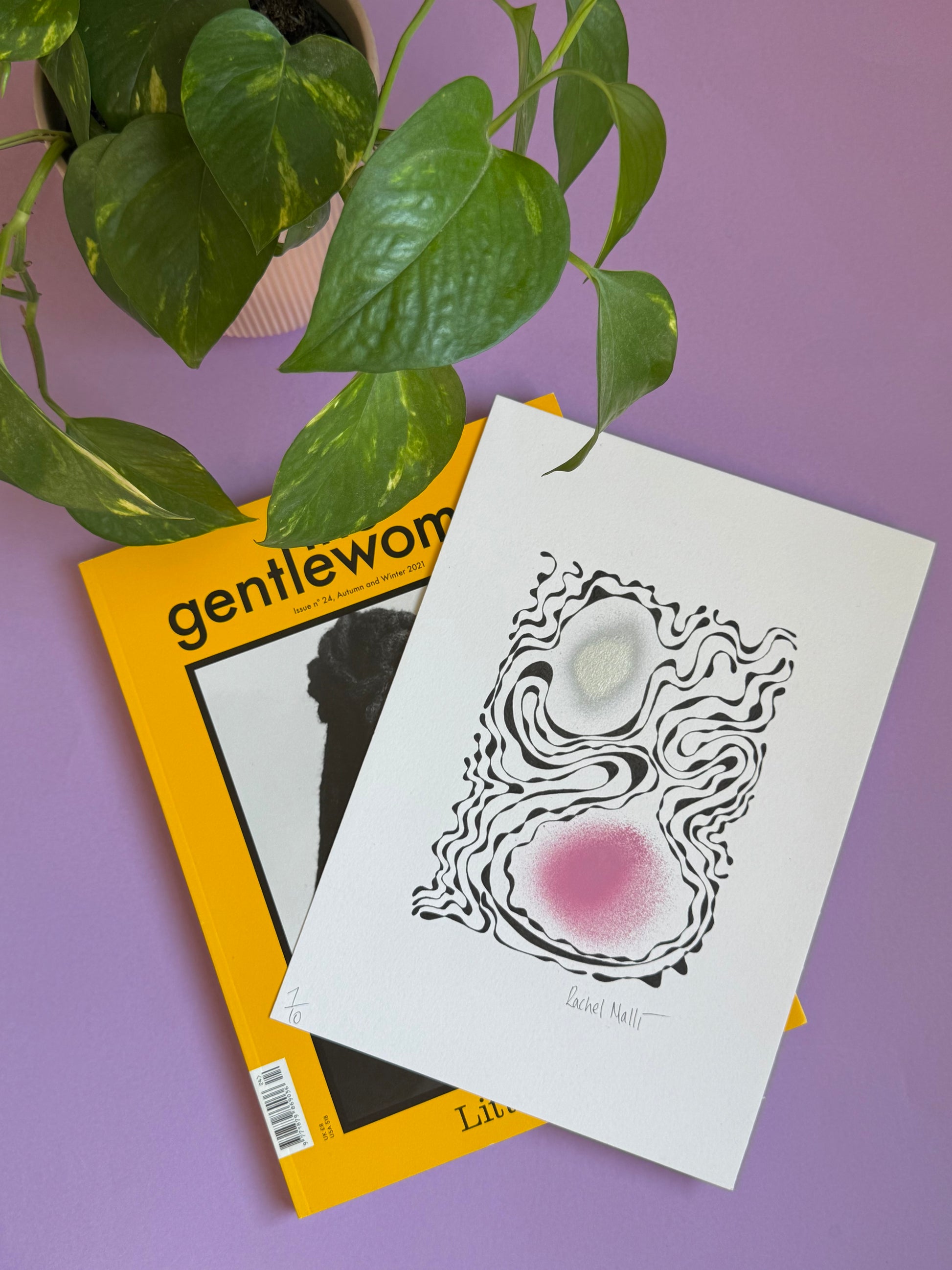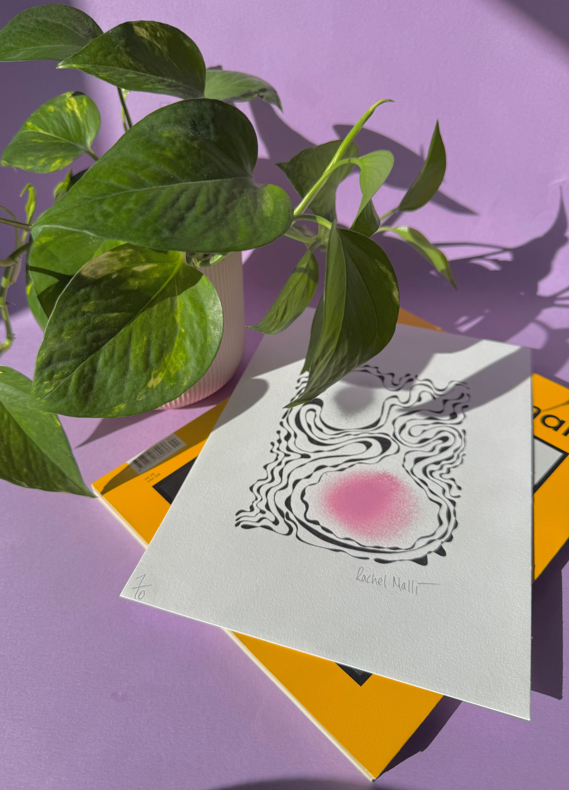 This series of work is a visual exploration of music's healing power in the face of profound loss. In the wake of pregnancy loss, I turned to music as a balm for my mental state. The spray paint embodies cellular formation and the mysteries of the fetus developing within the womb. The dark swirls disrupt this imagery, representing the loss itself, but also the anxiety and emotion involved in loss. This also represents the dynamic energy that music has provided in my journey of healing.