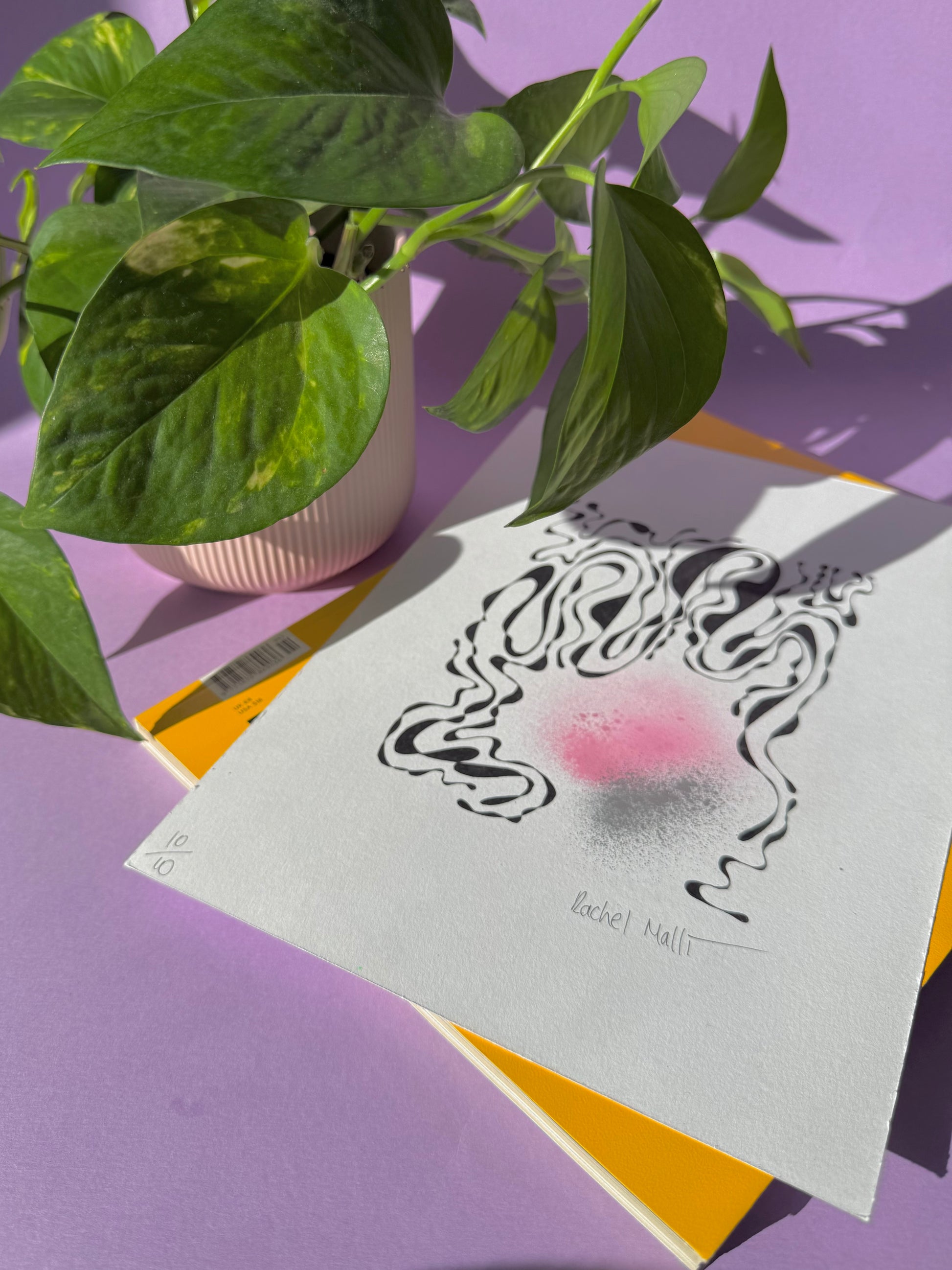 This series of work is a visual exploration of music's healing power in the face of profound loss. In the wake of pregnancy loss, I turned to music as a balm for my mental state. The spray paint embodies cellular formation and the mysteries of the fetus developing within the womb. The dark swirls disrupt this imagery, representing the loss itself, but also the anxiety and emotion involved in loss. This also represents the dynamic energy that music has provided in my journey of healing.